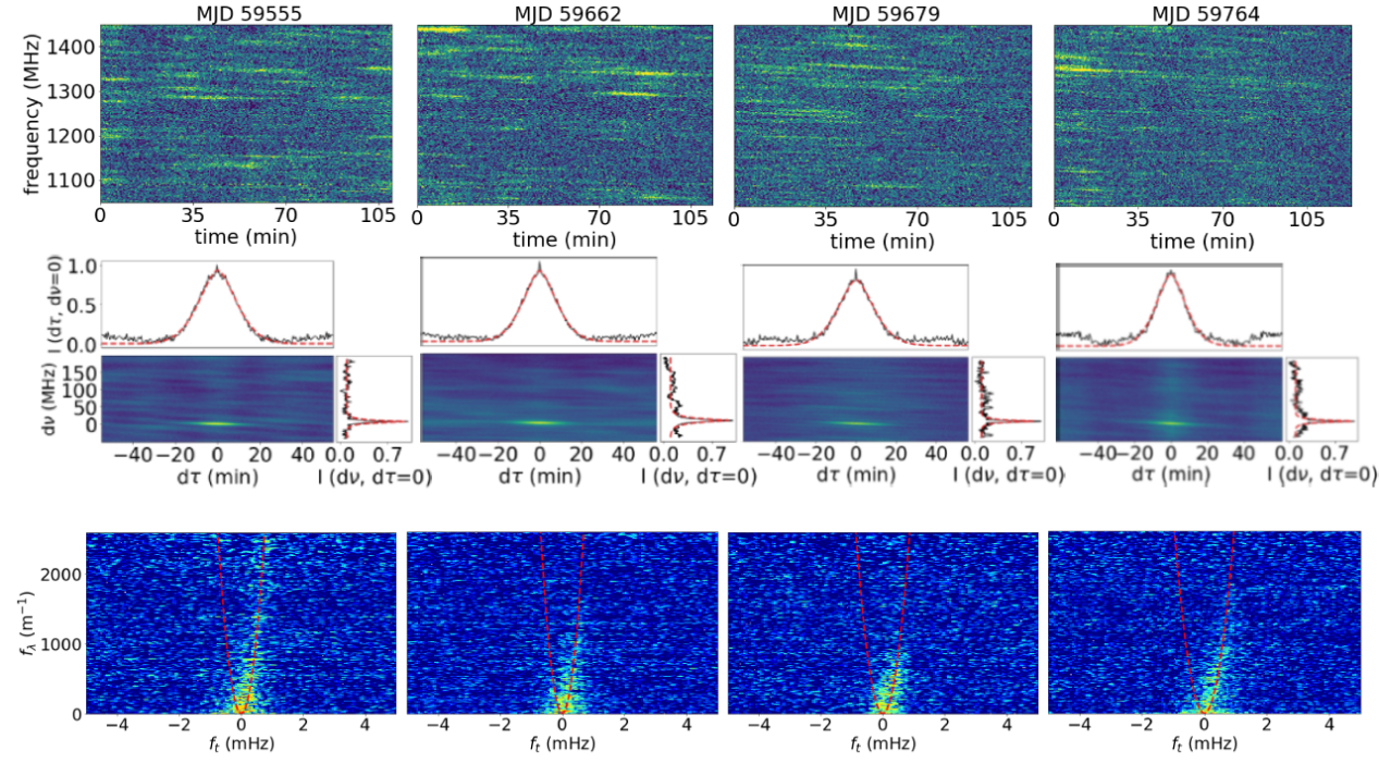 图3:脉冲星M2C的闪烁动态谱(上),动态谱的自相关函数分析(中)以及动态谱的二次谱(下)。