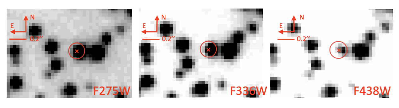图2:哈勃数据F275W、F336W和F438W三组图像中确认的M2C脉冲星伴星。红色十字标记表示射电定位点,红色圆圈半径为0.1角秒。圆圈内的恒星即为已确认的M2C伴星。